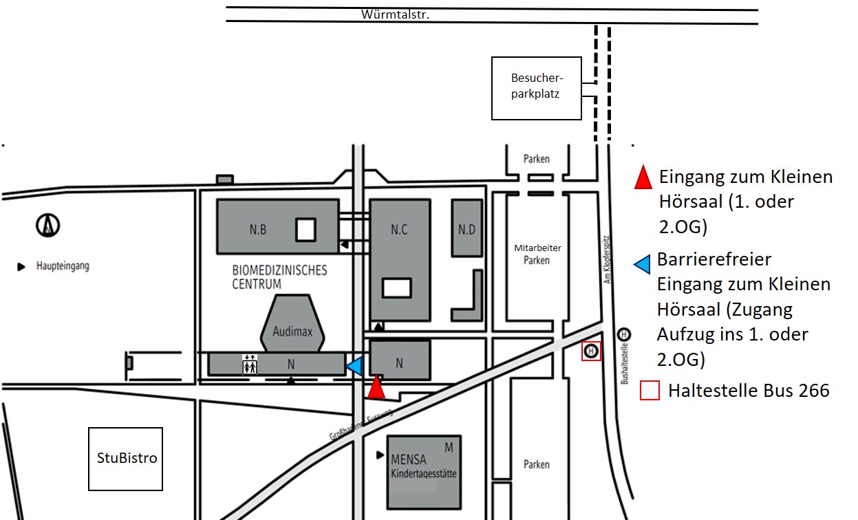Eine ausführliche Anfahrtsbeschreibung zum BMC finden Sie auf der Webseite: https://www.med.lmu.de/bmc/de/ueber-uns/kontakt-anfahrt/
